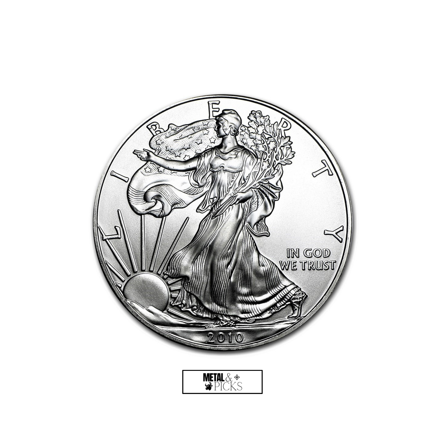 The obverse of the coin features a rendition of the goddess Liberty, based on Adolph A. Weinman’s 1916 “Walking Liberty” half dollar. It is inscribed with “LIBERTY,” “IN GOD WE TRUST,” and the year of issue, 2010.
