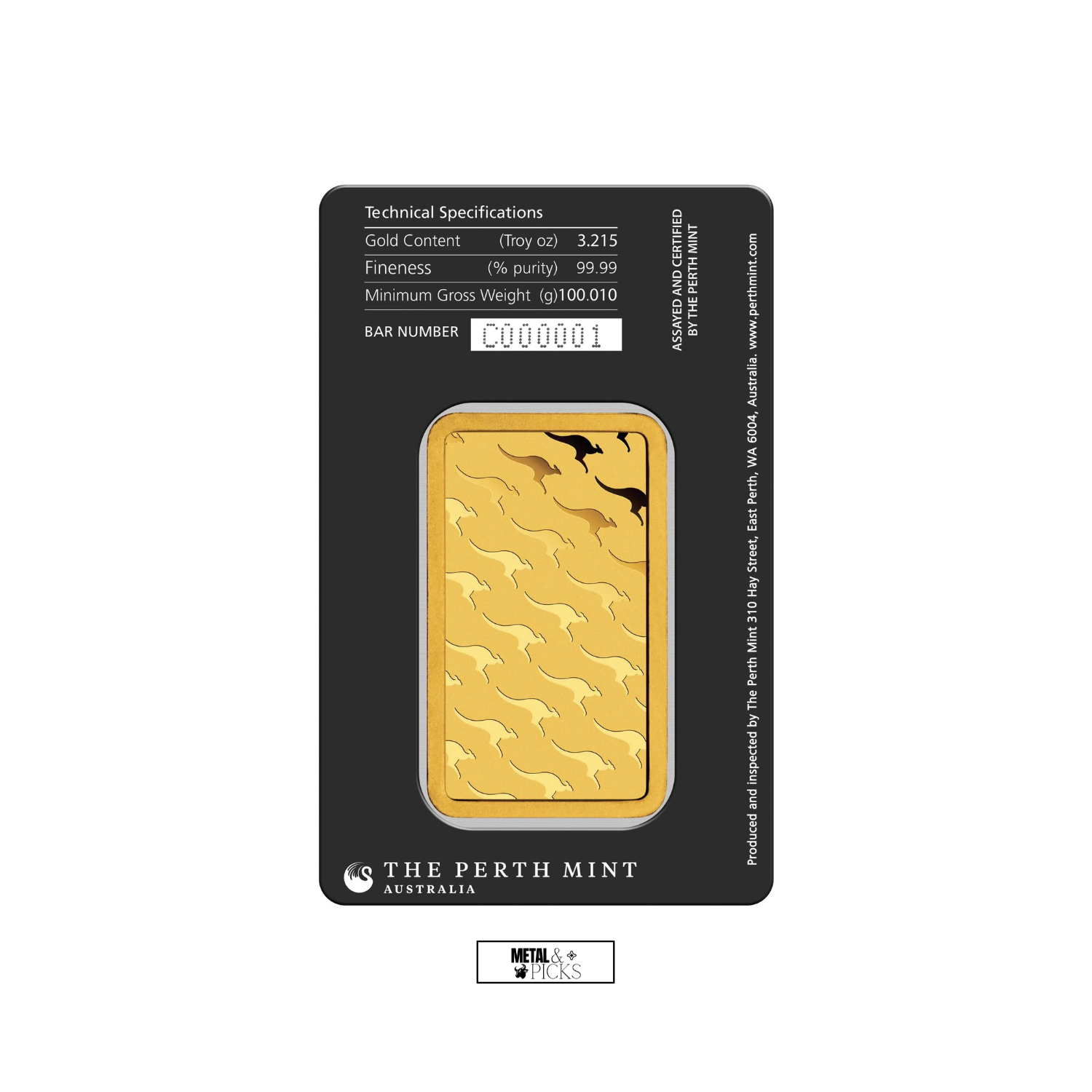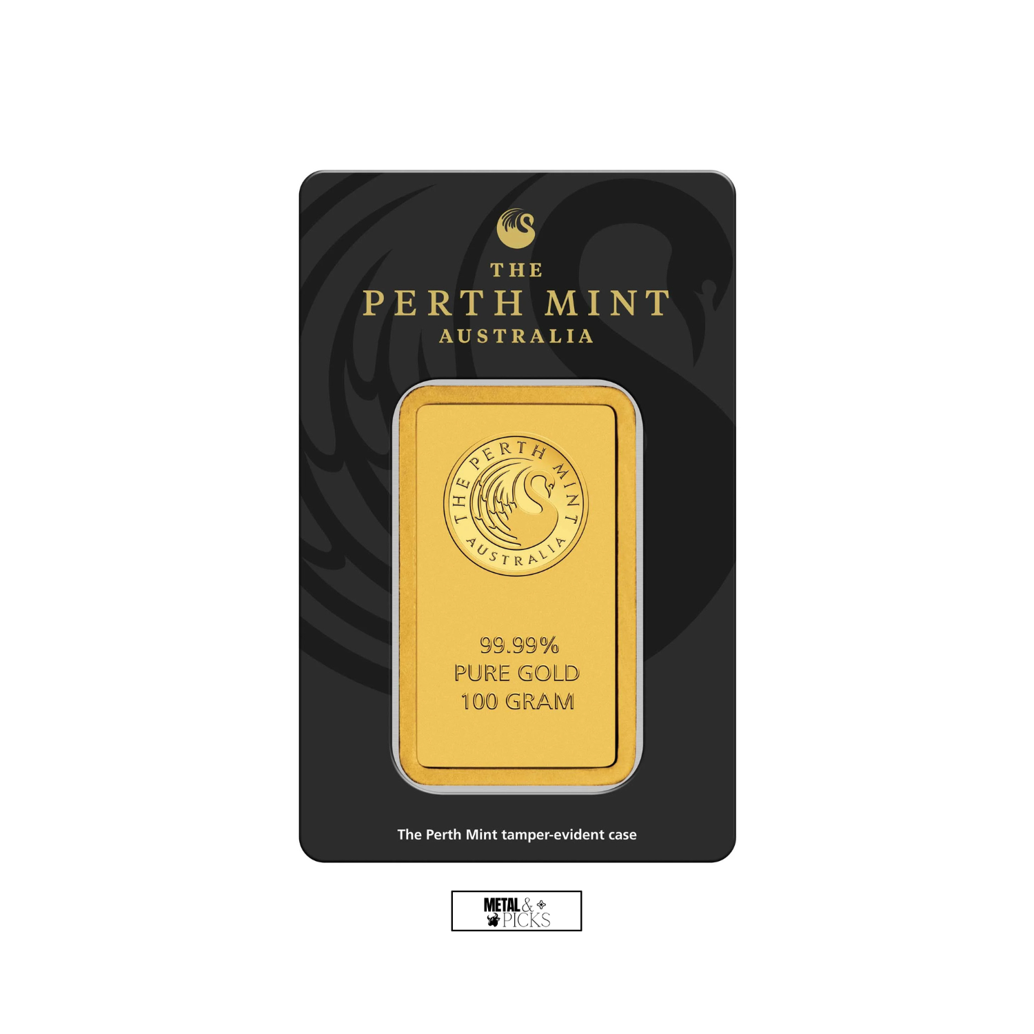 These elegant 100 gram minted gold bars from Perth Mint provide a practical and appealing option for expanding your precious metals holdings.